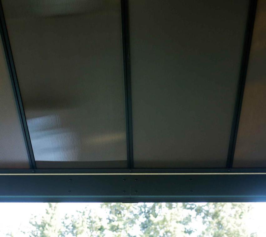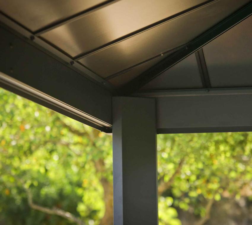 Modern, hochwertig, wetterfest - der Pavillon Dallas ist aus rostbeständigem Aluminium gefertigt und wird von einem stabilen Walmdach aus 6 mm Doppelstegpaneelen getoppt.