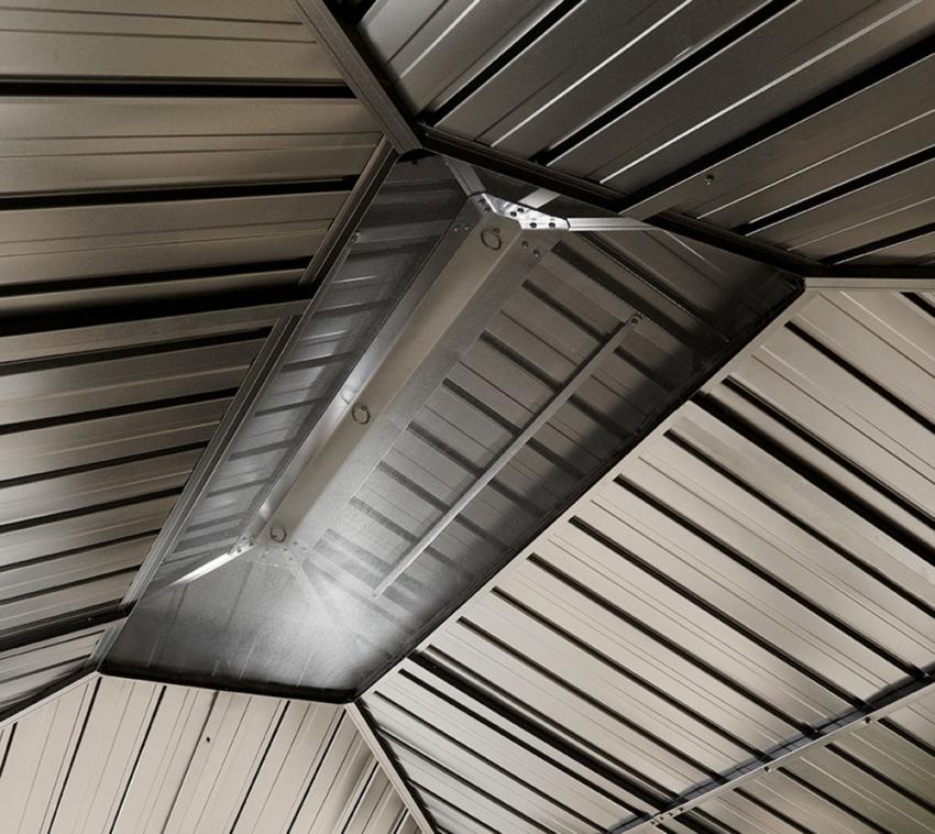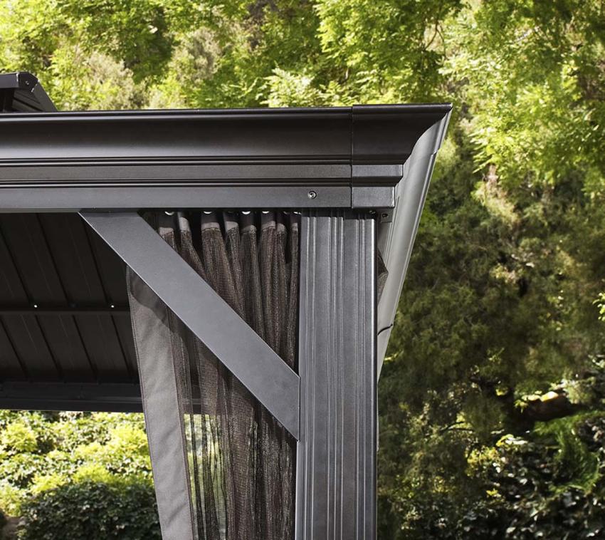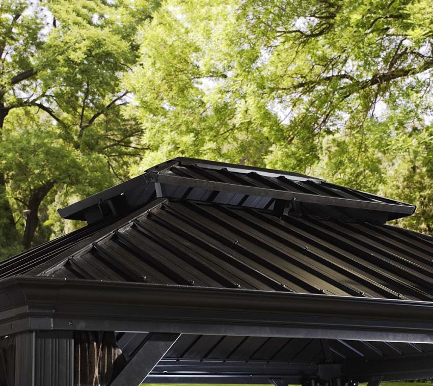Andere Pavillons wie feststehende Aluminium- und Stahlpavillons sind ohne besondere Pflege bereits wetterfest.