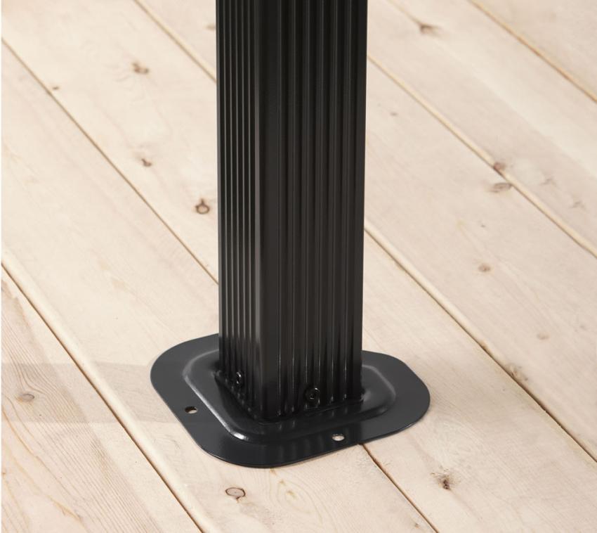 Das Modell Verona ist in einem edlen Anthrazitgrau gehalten. Optisch passende Vorhänge (Dunkelgrau) sind separat erhältlich. Der Aufbau ist unkompliziert und kann durch 2 Personen mit Hilfe der detaillierten Schritt-für-Schritt Anleitung sowie handelsüblichen Werkzeugen durchgeführt werden. Für den Aufbau sollten 4-5 Stunden eingeplant werden. Die Füße der Pfosten besitzen jeweils 3 Bohrungen. Das bedeutet, Sie benötigen zur Befestigung am Boden 12 Schrauben und Dübel.