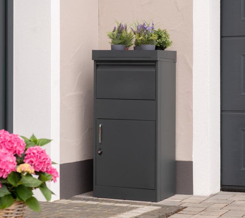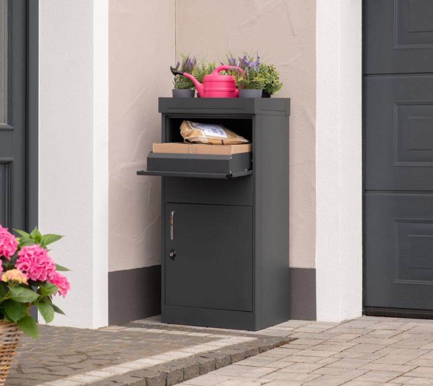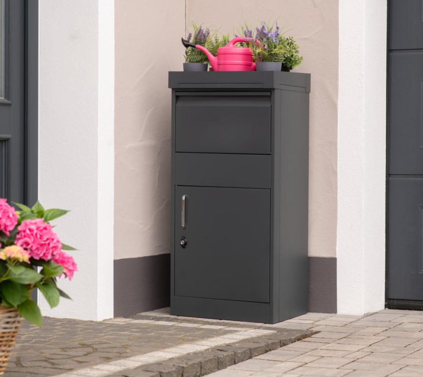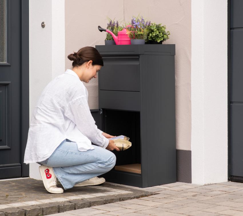 Sicher. Kontaktlos. Rund um die Uhr – Mit der abschließbaren Paketbox Piet von Westmann wird die Paketzustellung problemlos 24/7 möglich.