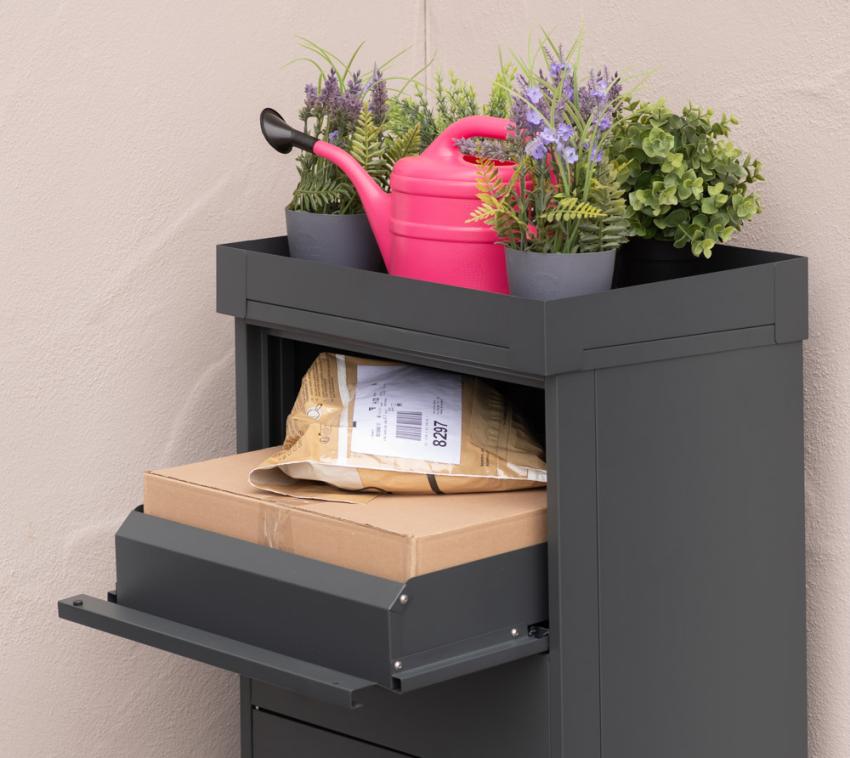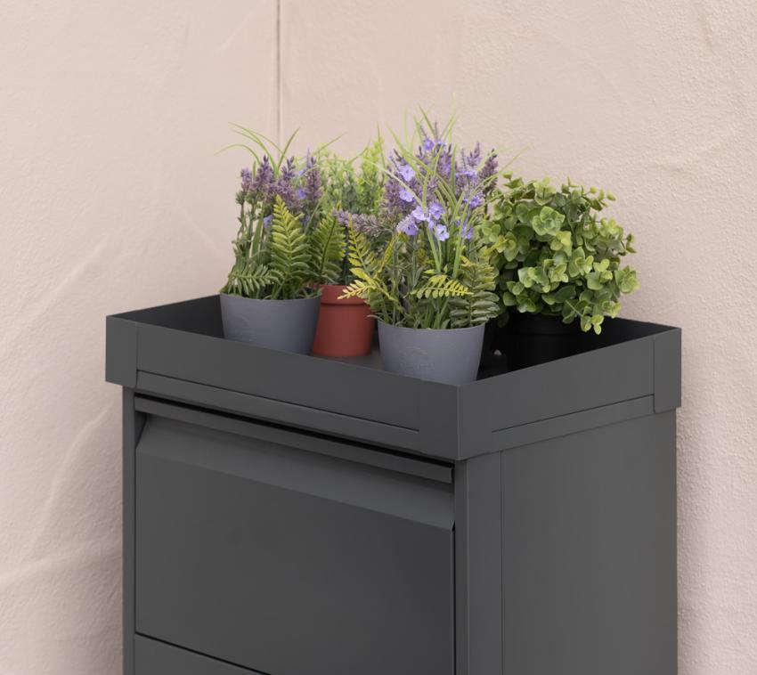Du hast etwas Wichtiges bestellt, bist dir aber nicht sicher, ob du deine Bestellung persönlich in Empfang nehmen kannst? Die Paketbox Piet von Westmann löst für dich genau dieses Problem, und sorgt im Handumdrehen für einen gut geschützten und abschließbaren Ablageort. Der Korpus der praktischen Paketbox besteht aus witterungsbeständigem, pulverbeschichtetem Stahl. Deine Pakete können ganz einfach vom Zusteller in das obige Kippfach gelegt werden, und fallen beim Schließen des Fachs automatisch in den abschließbaren Teil der Paketbox. Um Schäden durch Feuchtigkeit zu vermeiden, ist am Boden eine Zwischenablage eingebaut, sodass dein Paket keinen direkten Bodenkontakt hat. Damit deine Box sicher steht, kannst du sie ganz einfach über vorgebohrte Löcher am Untergrund fixieren. Besonderes Highlight dieser Paketbox ist der abnehmbare Pflanzkasten, den du individuell bepflanzen oder dekorieren kannst. Paketbox Piet von Westmann – Lieblingswaren bestellen, flexibel bleiben!