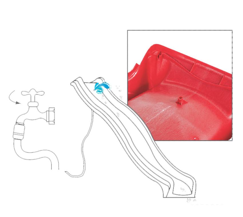 Wenn du den Rutschspaß verdoppeln möchtest, kannst du das Rutschmodul mit wenigen Handgriffen in eine erfrischende Wasserrutsche verwandeln. Hierfür bohrst du einfach am oben liegenden Teil der Rutsche ein Loch durch das gut sichtbare Verbindungsstück. Der Gartenschlauch lässt sich nun via Schlauchschelle am Verbindungsstück der Rutsche fixieren.