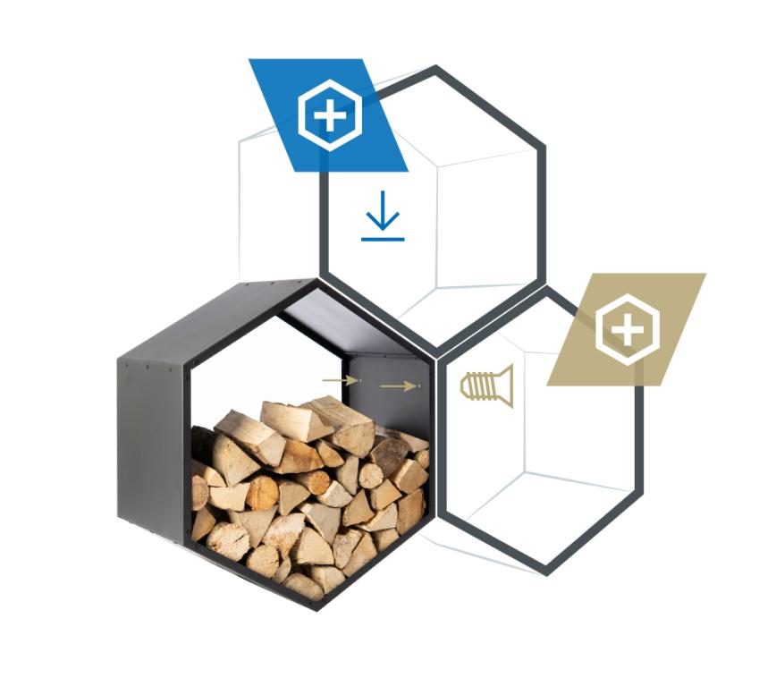 Modernes Design, maximale Funktion – das Kaminholzlager Biene von Westmann ist aus pulverbeschichtetem Stahl gefertigt und punktet mit der besonderen Optik in Wabenform.