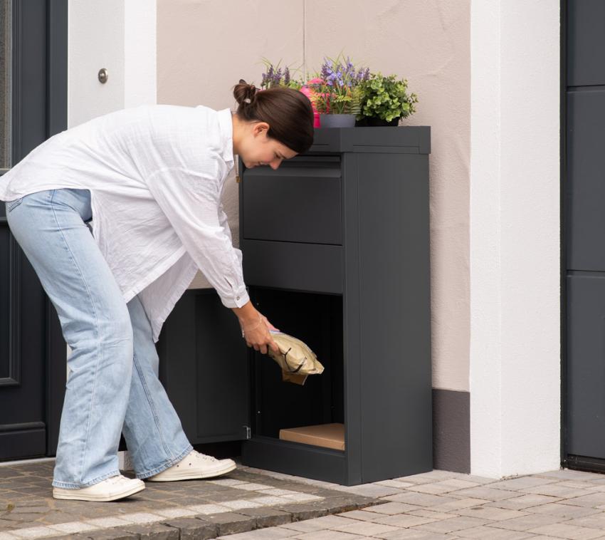 Sicher. Kontaktlos. Rund um die Uhr – Mit der abschließbaren Paketbox Piet von Westmann wird die Paketzustellung problemlos 24/7 möglich.