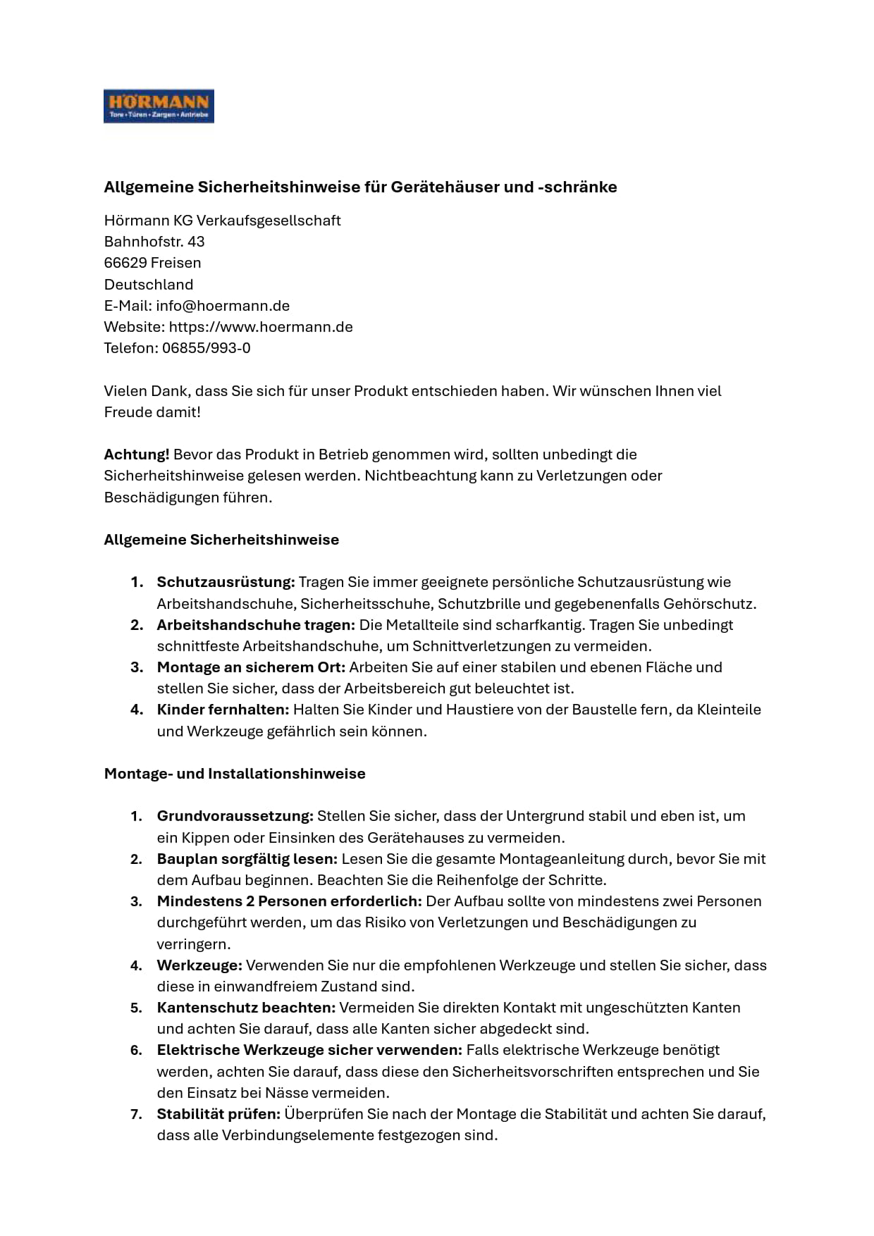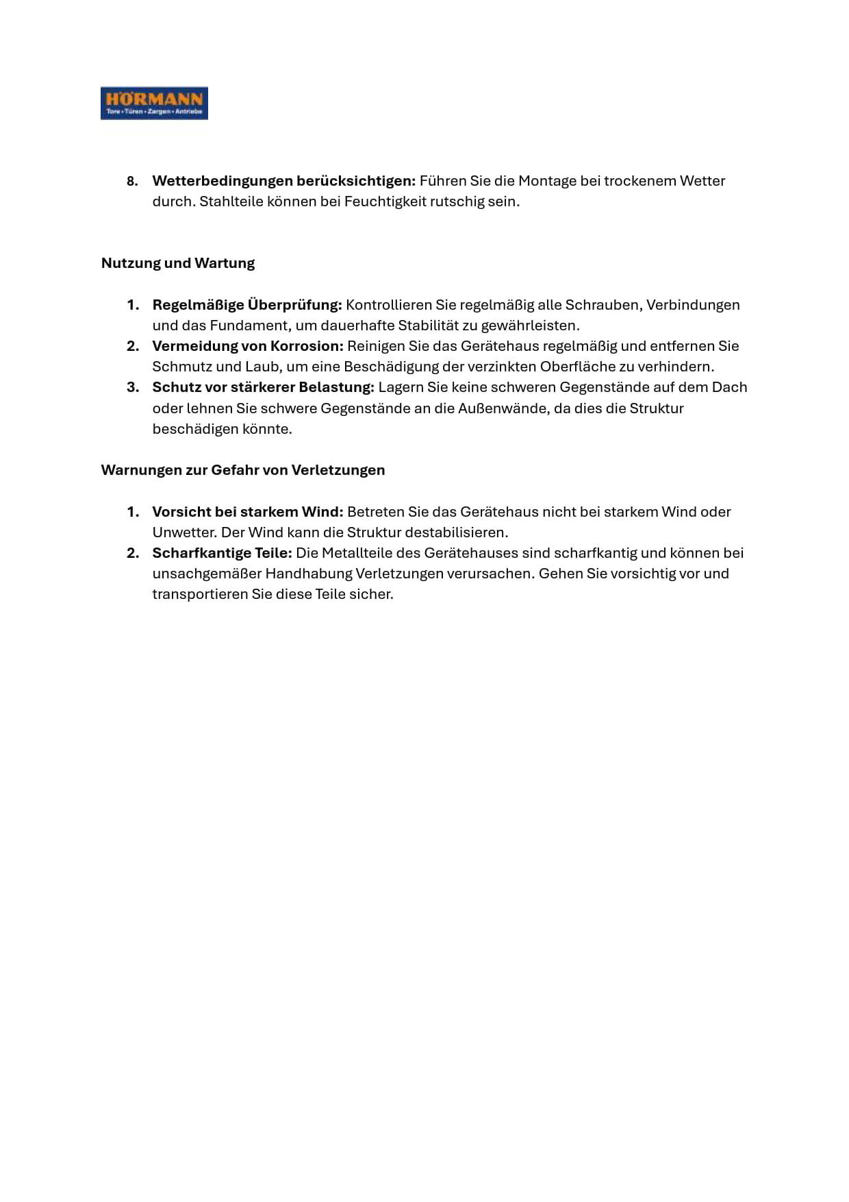 Für die Dauer der Garantie beseitigt Hörmann alle Mängel am Hörmann Gerätehaus / Kaminholzregal, die nachweislich auf einen Material- oder Herstellungsfehler zurückzuführen sind. Wir verpflichten uns, nach unserer Wahl die mangelhafte Ware gegen mangelfreie zu ersetzen, nachzubessern oder einen Minderwert zu ersetzen, wobei wir die Kosten für Auf- und Abbaukosten sowie mögliche Ein- und Ausbaukosten als auch Versandkosten nicht übernehmen. Ersetzte Teile werden unser Eigentum oder sind wahlweise von dem Kunden zu entsorgen. Für Kunststoff-, Gummi- und Elektroteile gilt die gesetzliche Gewährleistungsfrist. Auch übernehmen wir für mögliche Folgeschäden keine Haftung.