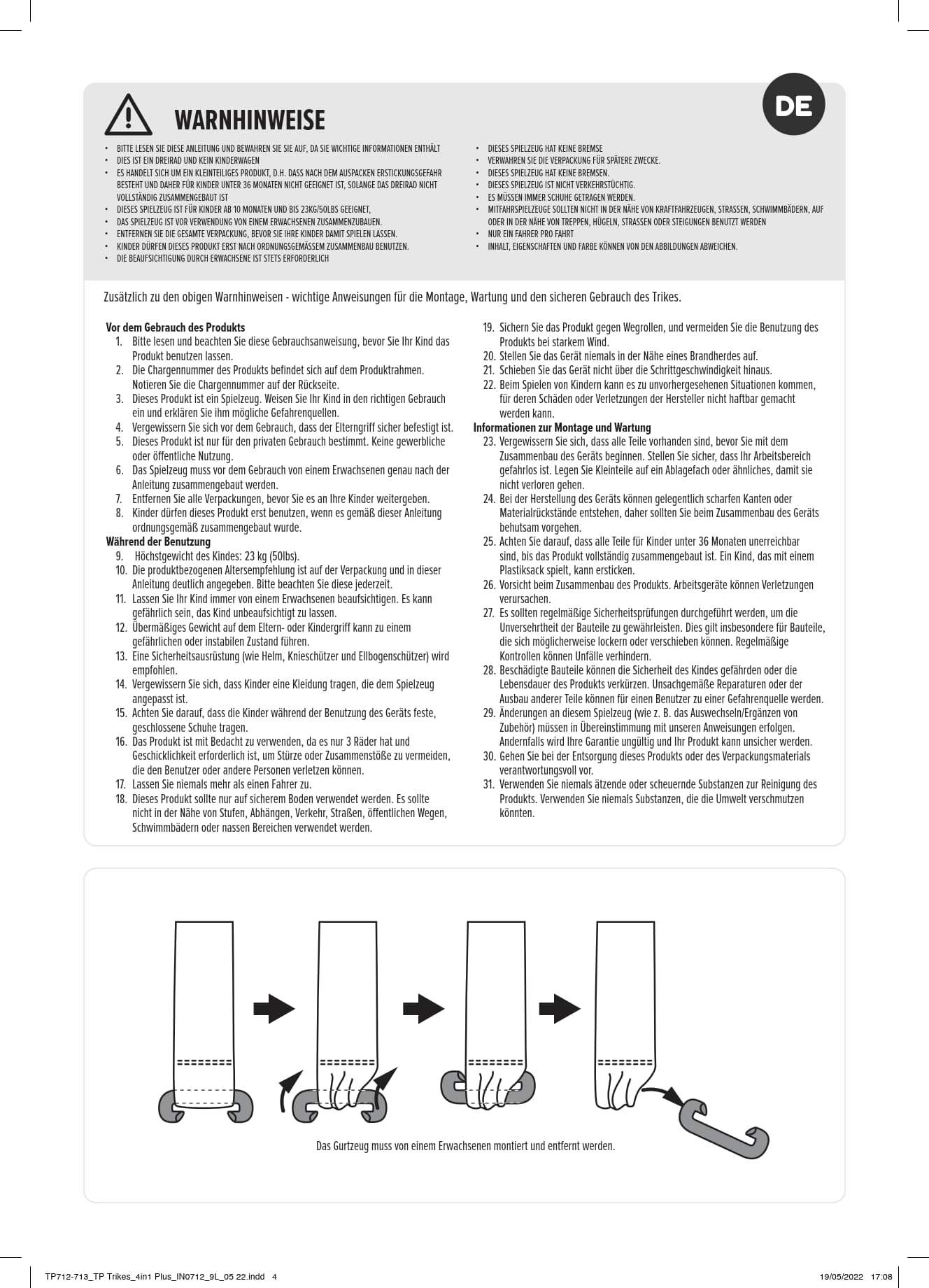 Die Einstellung der Stufen hängt vom Entwicklungsstand deines Kindes ab, und kann variieren. Dein Kind sollte das Dreirad immer nur unter Aufsicht benutzen. Unsere Empfehlung: