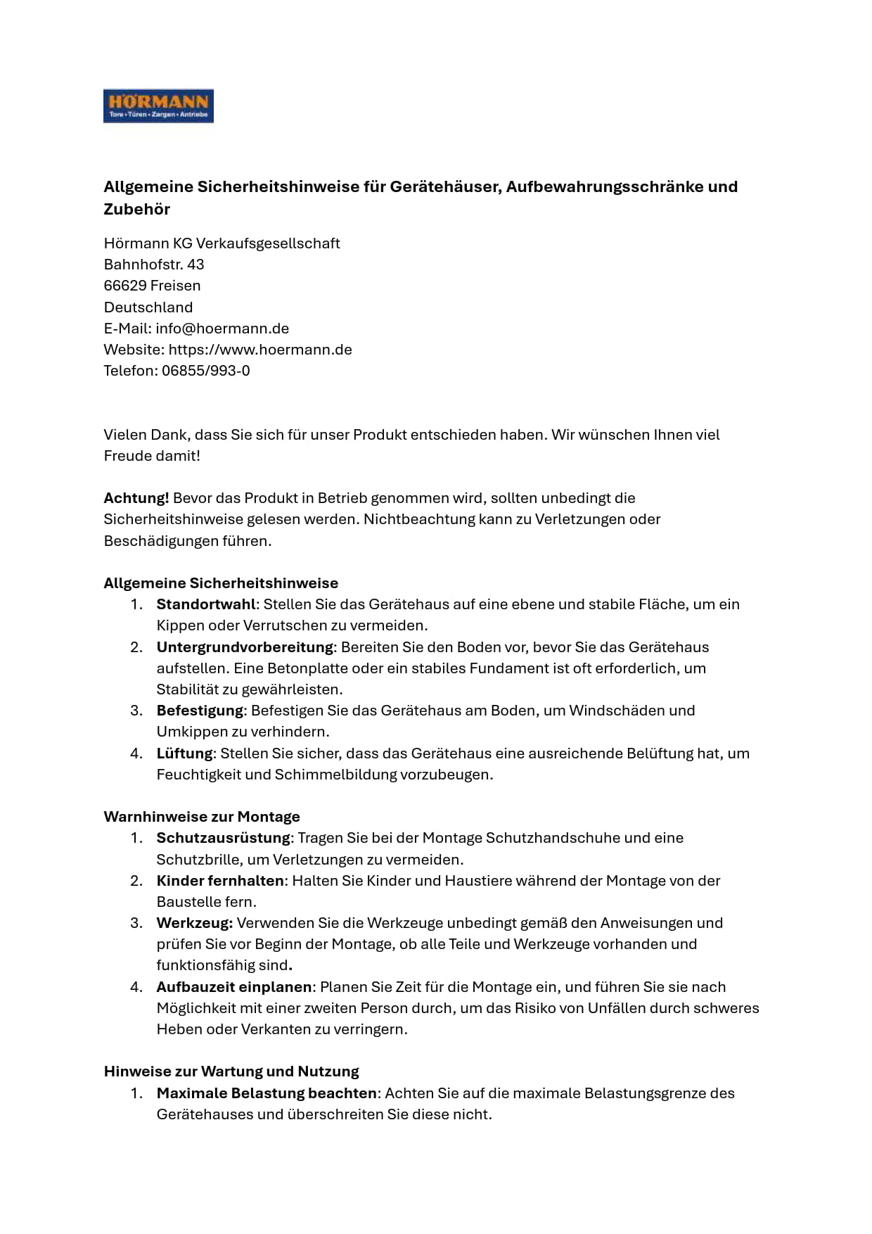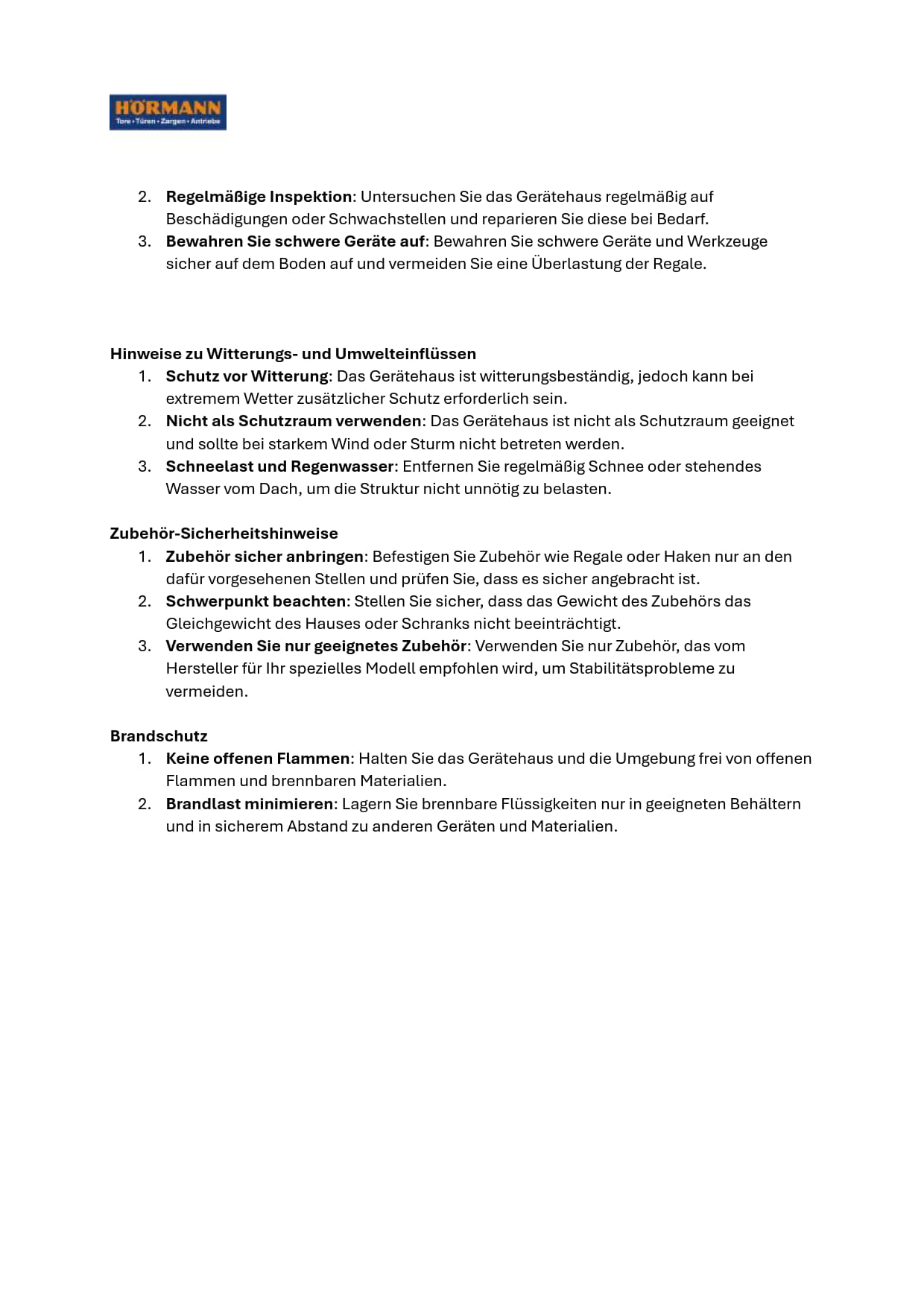 Für die Dauer der Garantie beseitigt Hörmann alle Mängel am Hörmann Gerätehaus / Kaminholzregal, die nachweislich auf einen Material- oder Herstellungsfehler zurückzuführen sind. Wir verpflichten uns, nach unserer Wahl die mangelhafte Ware gegen mangelfreie zu ersetzen, nachzubessern oder einen Minderwert zu ersetzen, wobei wir die Kosten für Auf- und Abbaukosten sowie mögliche Ein- und Ausbaukosten als auch Versandkosten nicht übernehmen. Ersetzte Teile werden unser Eigentum oder sind wahlweise von dem Kunden zu entsorgen. Für Kunststoff-, Gummi- und Elektroteile gilt die gesetzliche Gewährleistungsfrist. Auch übernehmen wir für mögliche Folgeschäden keine Haftung.