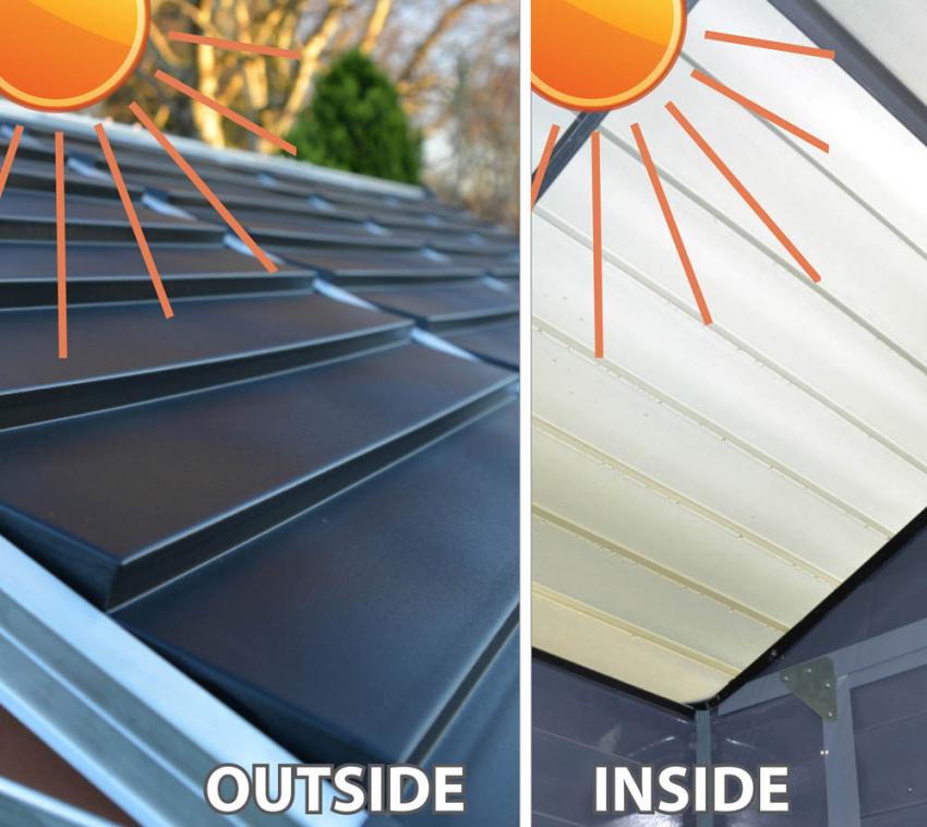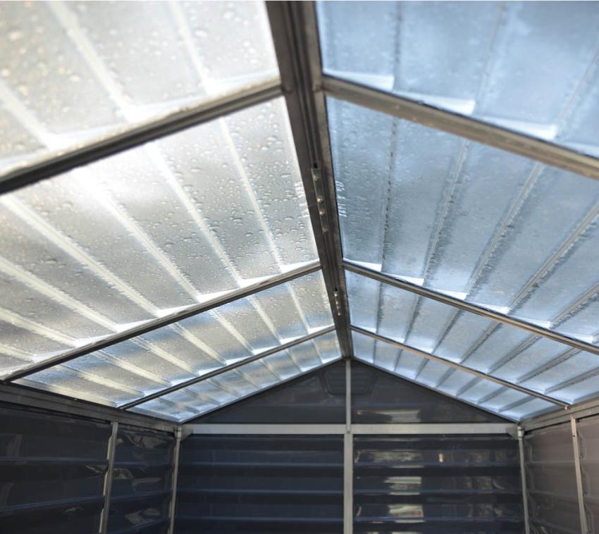 Robust und effizient - Optimal nutzbarer Stauraum und hochwertige Kunststoffpaneele plus Aluminiumrahmen machen dieses Gerätehaus zum praktischen Ordnungshelfer für Ihren Garten.