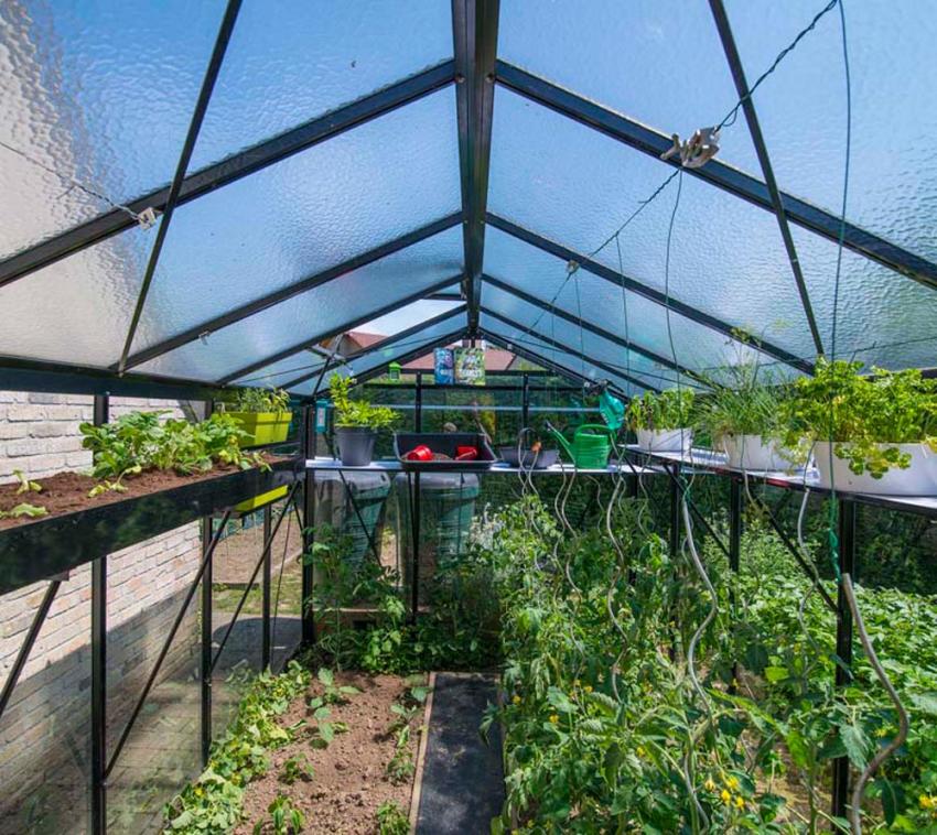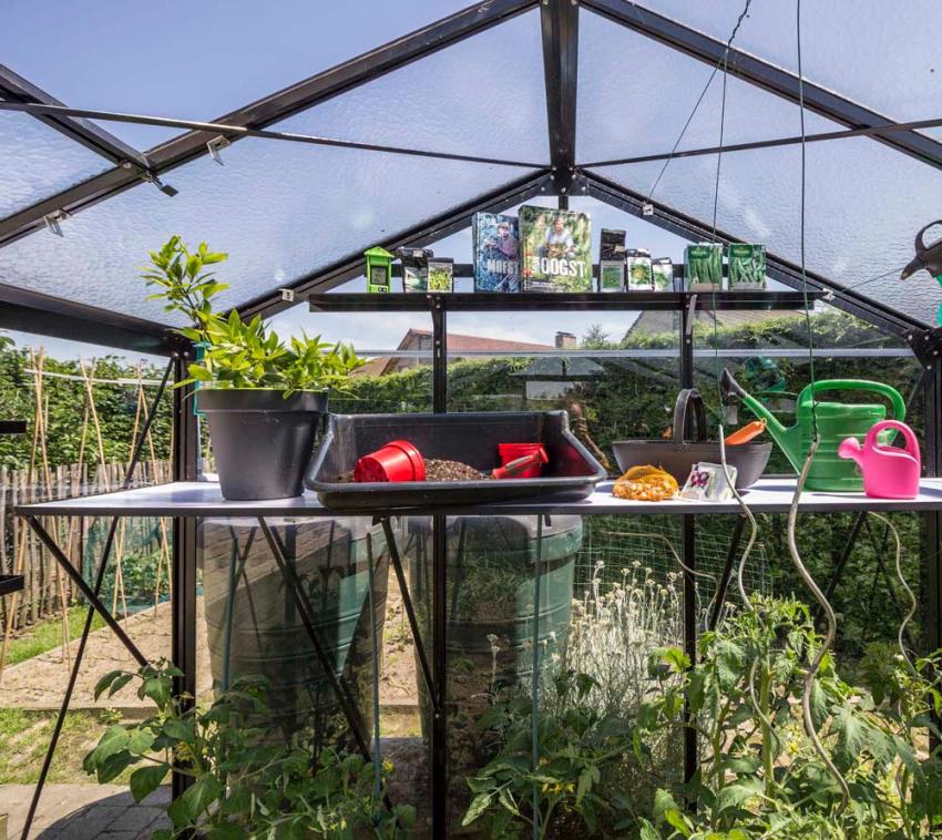So garantiert die extreme Traufenhöhe eine angenehme Steh- und Arbeitshöhe. Es können Tomatenstauden, Pflanztische oder Ähnliches komfortabel an den Seiten untergebracht werden. Ein Doppelrohrrahmen und ein Dachfenster werden gleich mitgeliefert.