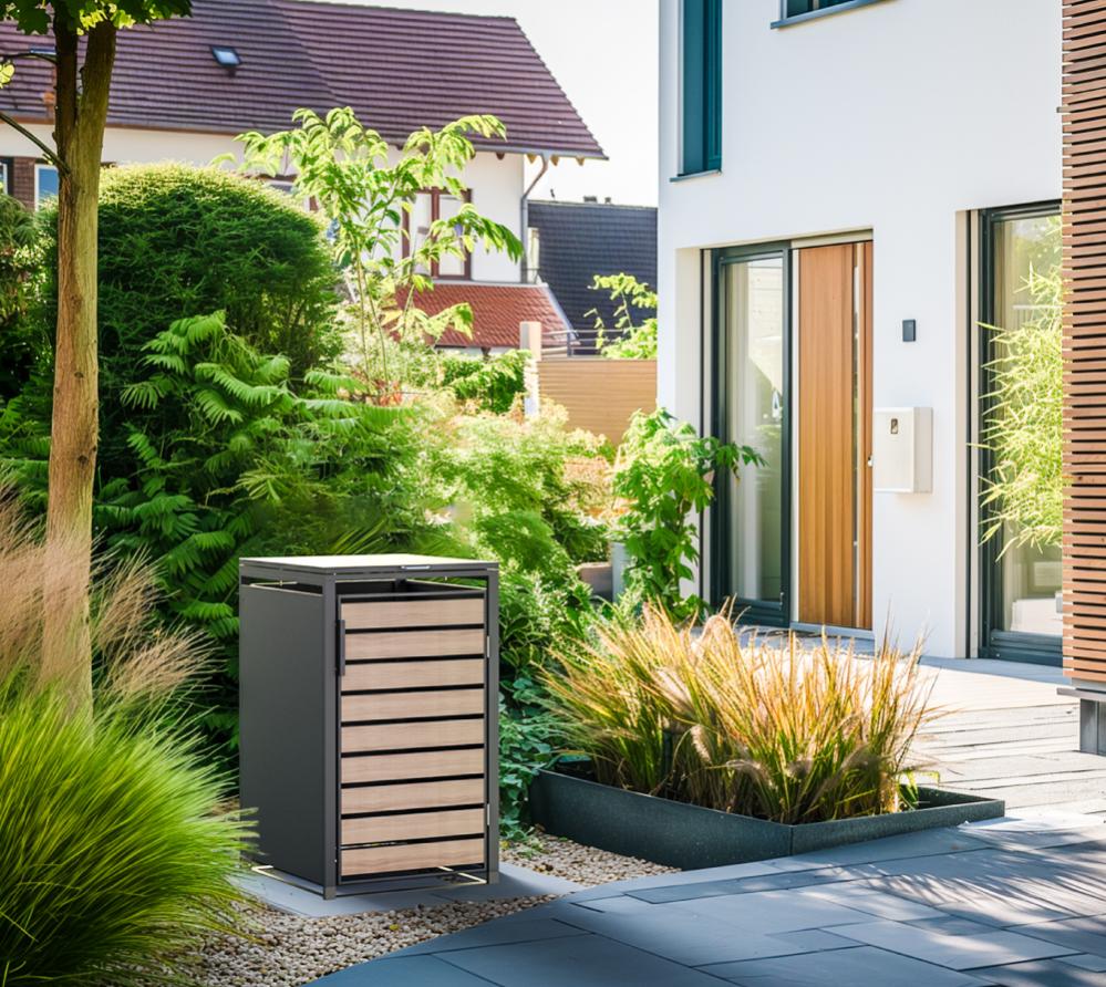 Kaum ein Gegenstand des täglichen Gebrauchs ist so essenziell und gleichzeitig so unansehnlich wie die Mülltonne. Mit der Mülltonnenbox Lacina von Westmann lösen wir dieses Problem! Die Mülltonnenverkleidung versteckt deine Mülltonne gekonnt hinter einem modernen Stahlkorpus. Um deine Mülltonne zu befüllen, lässt sich die Mülltonnenbox einfach per Deckel öffnen. Die am Deckel angebrachten Gasdruckfedern verhindern das unkontrollierte Zufallen des Deckels — das Befüllen der Mülltonne ist somit problemlos und ohne Verletzungsrisiko möglich. Dank leichtgängiger Fronttür lässt sich die Tonne mühelos in die Mülltonnenbox hineinschieben. Neben der sichtbaren Aufwertung schützt die Mülltonnenbox deine Mülltonne auch vor starker Sonneneinstrahlung und beugt somit intensiver Geruchsentwicklung vor.