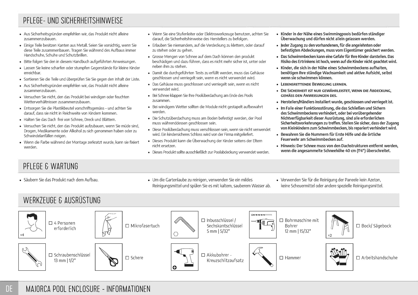 Du hast deinen Garten bereits in ein Poolparadies verwandelt, und möchtest deinen Pool hinsichtlich Sicherheit und Nutzbarkeit auf ein optimales Level heben? Die Poolüberdachung Majorca von Palram - Canopia basiert auf einer massiven Aluminiumkonstruktion, und wird von kristallklaren, sowie hoch belastbaren Polycarbonat-Paneelen getoppt. Durch die Kombination dieser Materialien wird dein Pool zum wetterunabhängigen und sicheren, jederzeit einsehbaren Badeort. Dank des schienenfreien Teleskopsystems auf Rädern lässt sich die Abdeckung einfach und verletzungsfrei von einer Person öffnen und schließen. Die Abdeckung hält zuverlässig den Schmutz fern, sorgt für niedrigeren Wärmeverlust des Wassers, und schließt deinen Pool mit dem patentierten Push`n Lock Befestigungssystem kindersicher ab. Majorca von Palram – Canopia: Mehr Sicherheit, mehr Poolspaß, mehr Komfort!