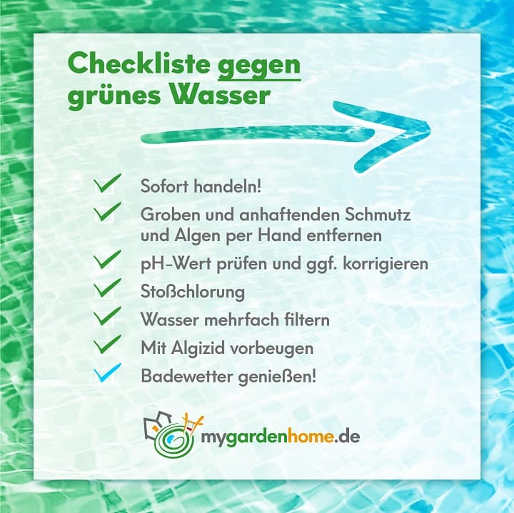 Sollte das Wasser nur eine leichte Grünverfärbung haben können Sie versuchen es mit einem Algenschutzmittel zu bekämpfen (Algizid). Ist das Wasser bereits stark grün verfärbt und haben sich bereits Algen am Boden und am Rand abgesetzt, müssen mehrere Schritte für die Reinigung des Wassers durchgeführt werden.