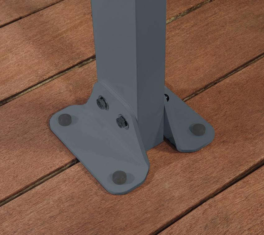 Massive Konstruktion aus einbrennlackiertem Aluminium und galvanisierten Stahlverbindungen.