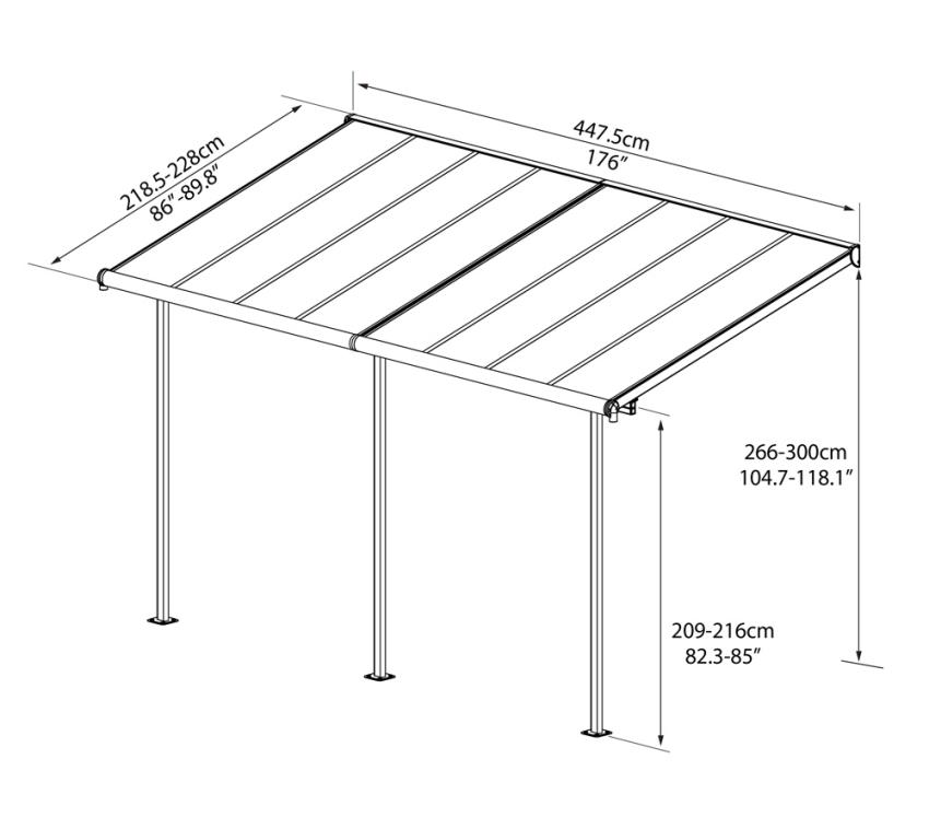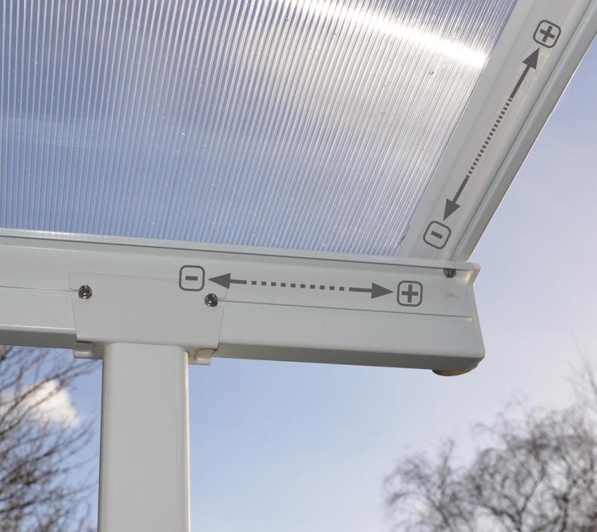 Durch die wählbare Anbringung der Höhe von 266-300 cm sowie den flexiblen Außenpfosten ist die Überdachung variabel anbringbar und passt sich allen Gegebenheiten an.