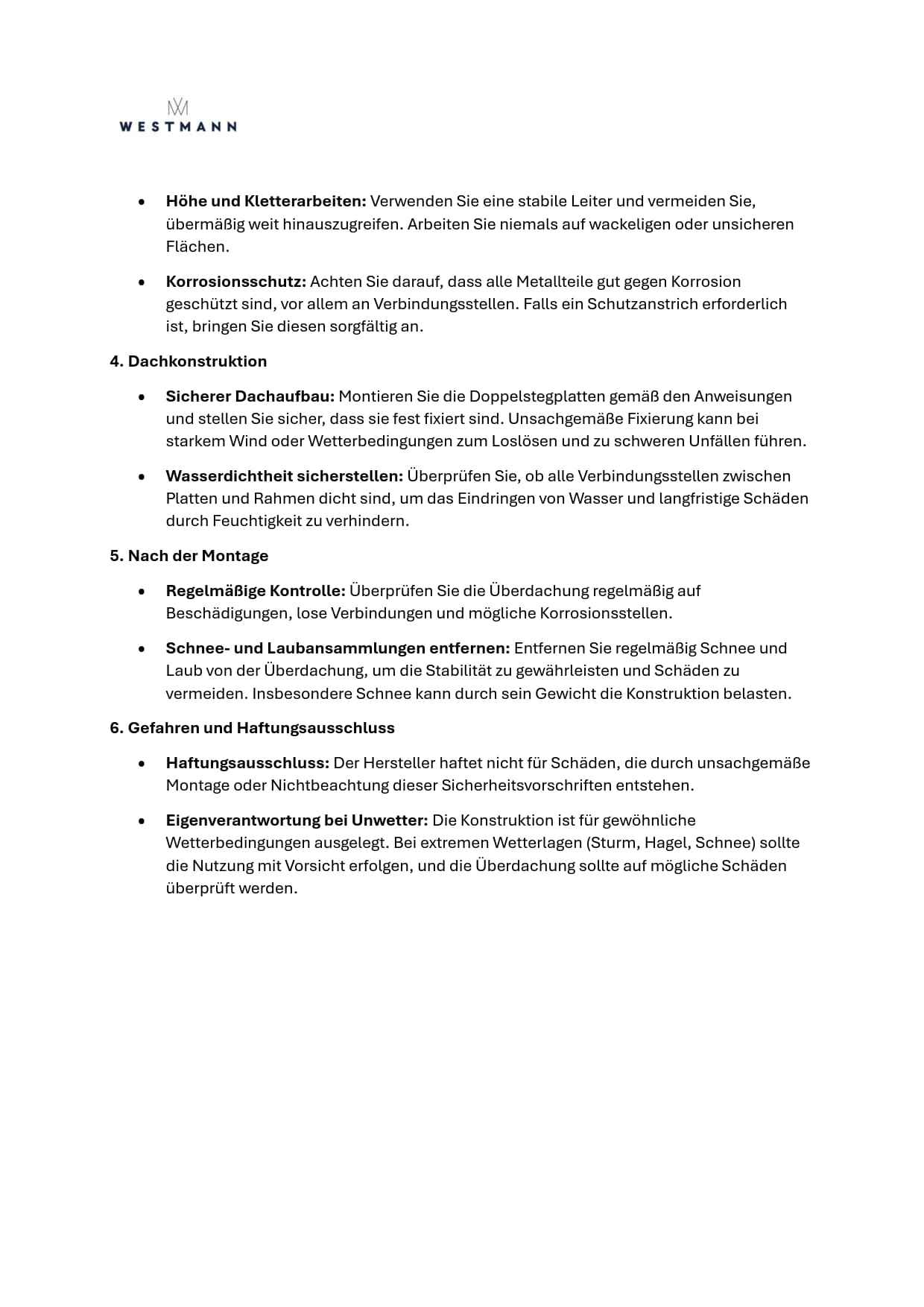 - Das Terrassenvordach muss auf einem flachen und befestigten Untergrund wie Zement oder Fliesen befestigt werden.